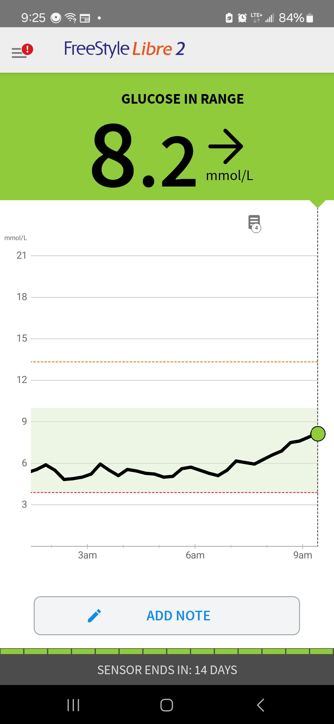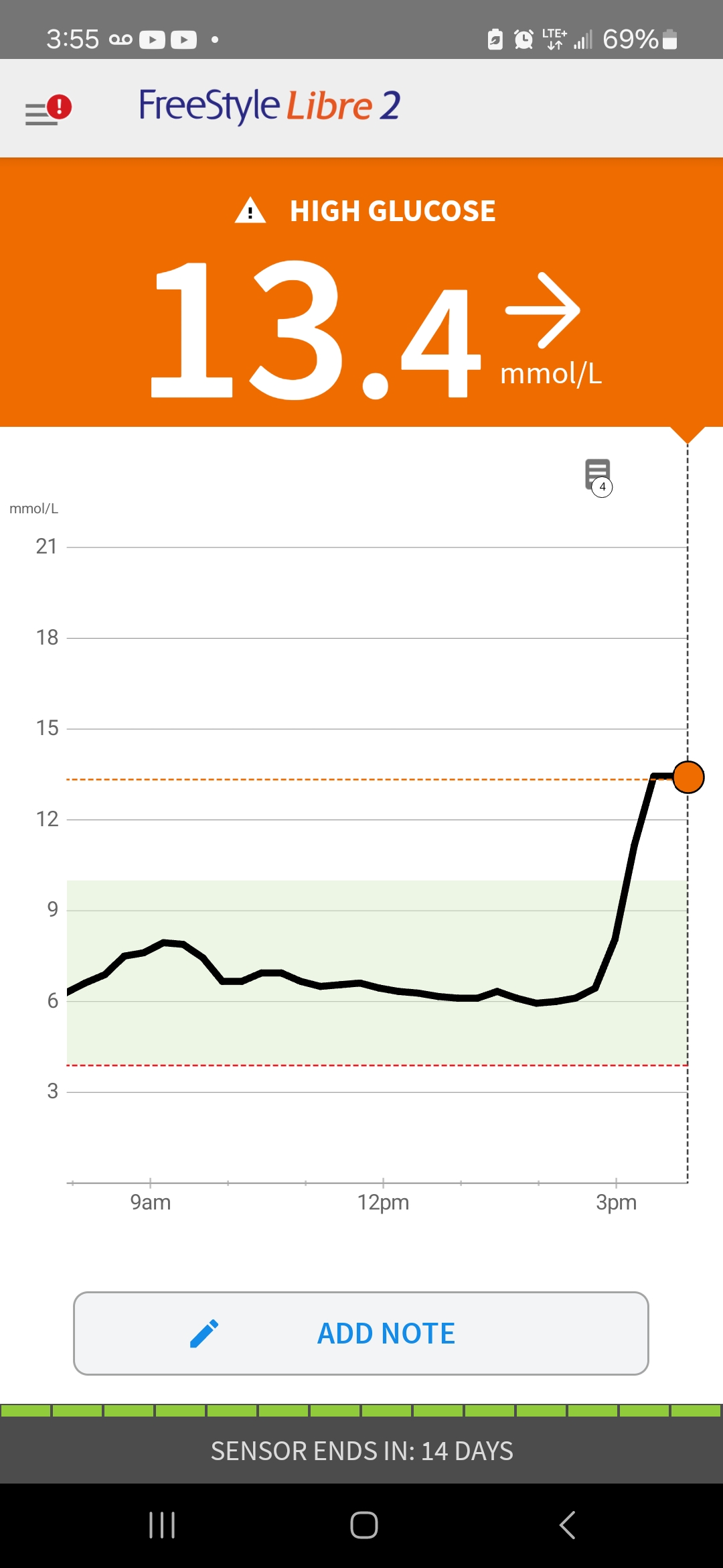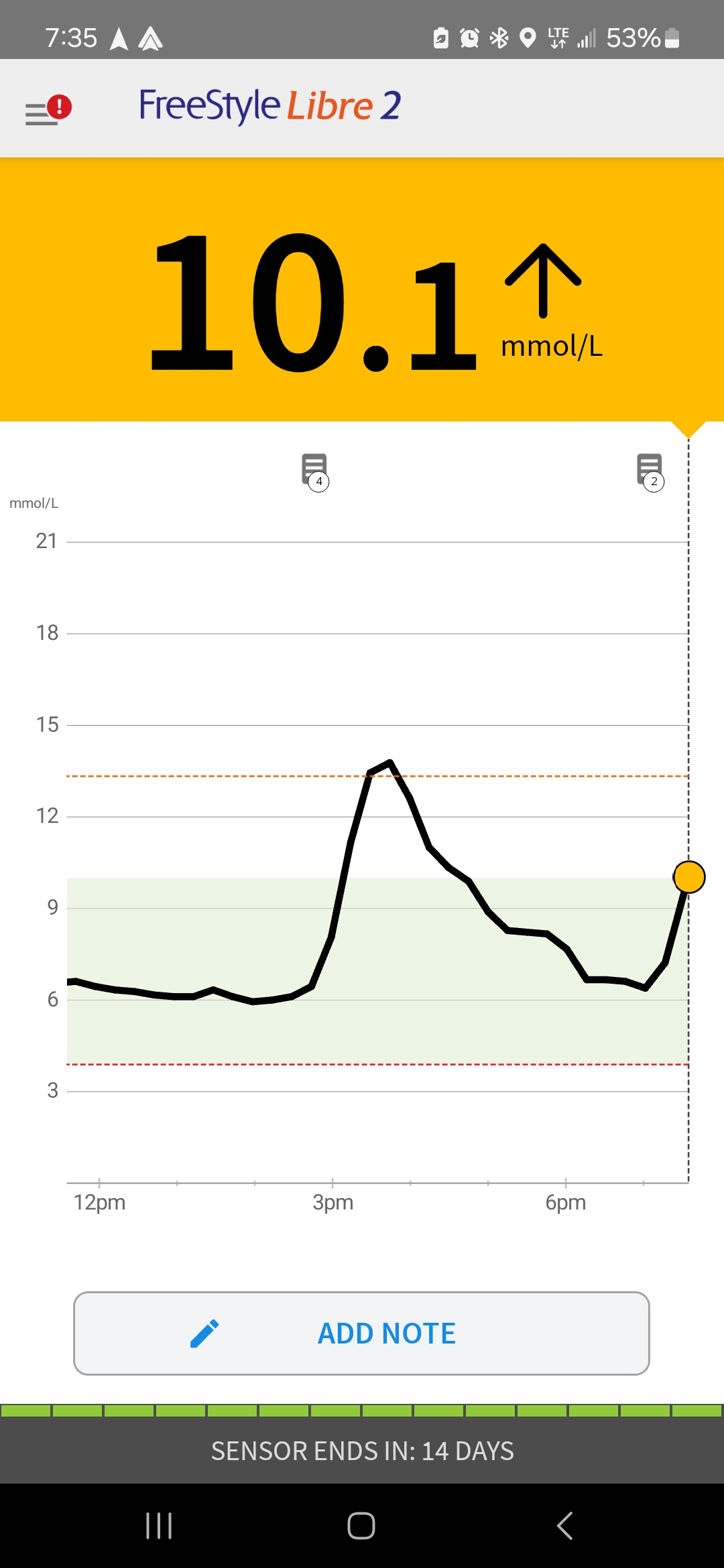 먹을 땐 6점 대였는데 운전하고 집에 오는 사이에 혈액에 sugar가 아주 농~ 해진 것을 데이터가 보여준다.