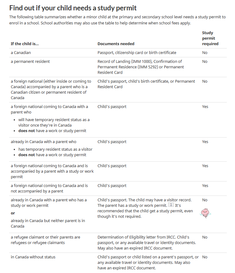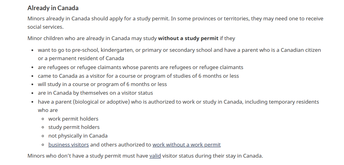 link: https://www.canada.ca/en/immigration-refugees-citizenship/services/study-canada/study-permit/apply.html#within_canada Minors who don't have a study permit must have valid visitor status during their stay in Canada.