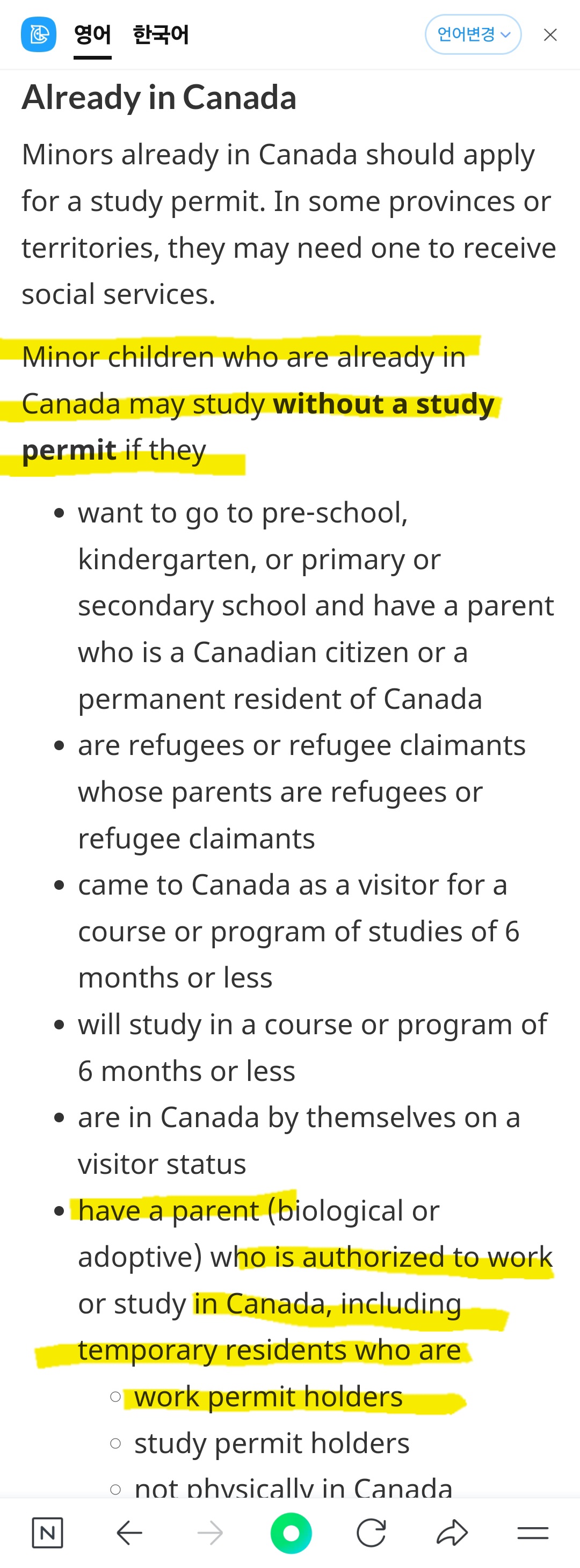already in Canada with a parent who has a study or work permit =>> study permit is not required입국시 받은 도장 여권에 있음