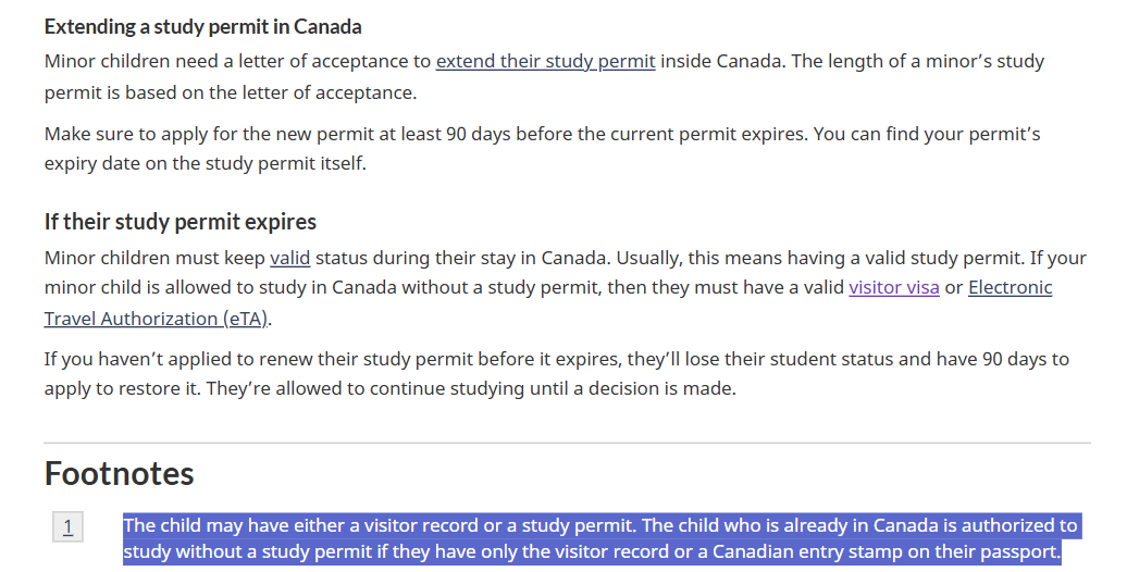 연장 신청은 현재 permit 만기보다 최소 90일 이전에 신청해야하고 만료 이후에는 학생 신분을 잃고 restore하는데 90일이 걸릴 것이며 결정이 날 때까지 학업을 지속할 수 없음.The child who is already in Canada is authorized to study without a study permit if they have only the visitor record or a Canadian entry stamp on their passport.