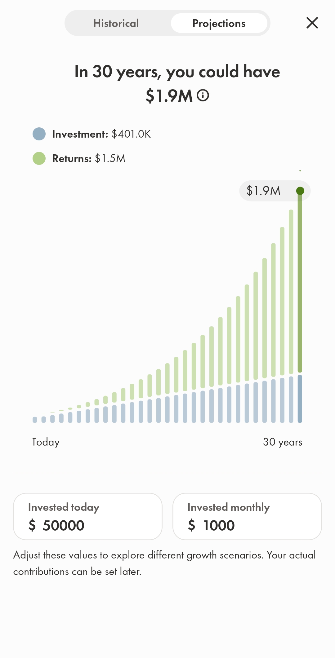 총5가지의 포트폴리오가 나오고 historical로 백테스트 (의미 없다고 생각하지만) 보여주고 예상금액(projection)도 보여준다.
